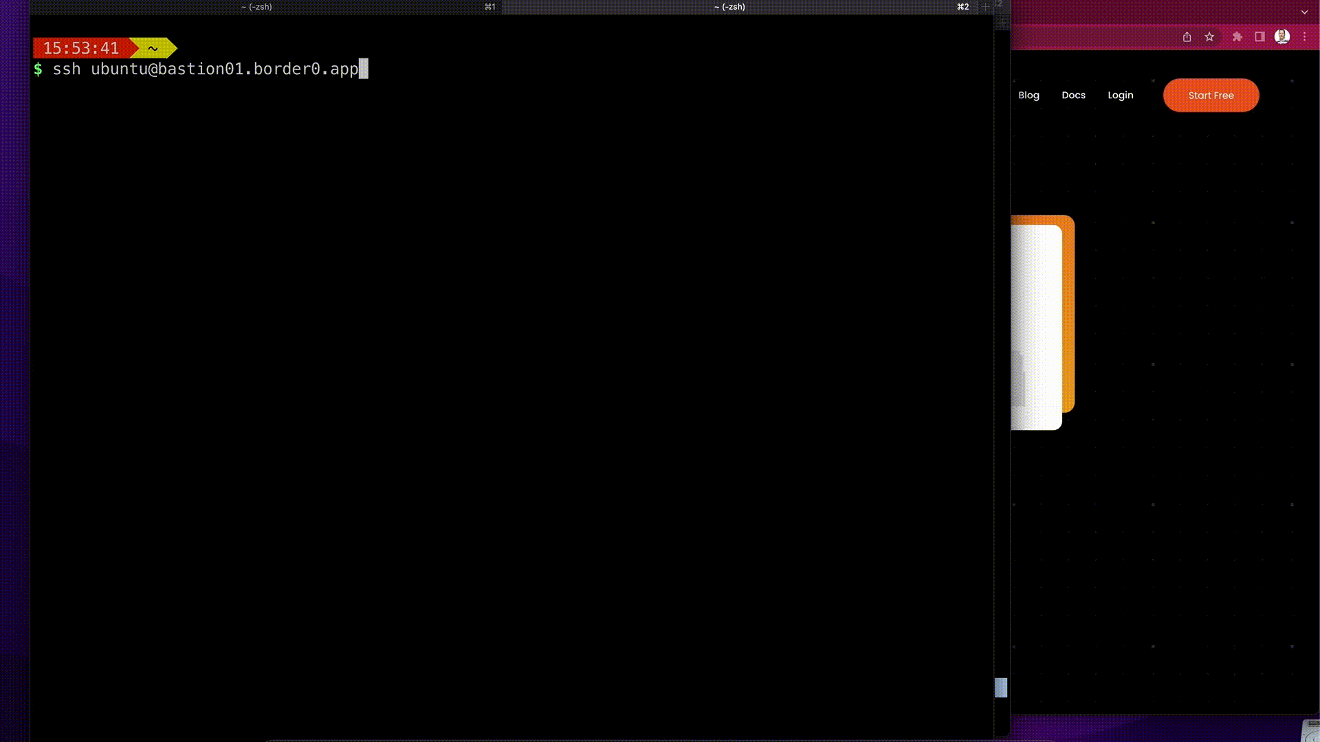 First, we use the regular OpenSSH client to demonstrate that we integrate with existing workflows and that engineers can keep using the tools they know and love. The second SSH session is started with the command: border0 client ssh and will show the user all SSH servers they have access to and can then select which server they want to connect to.